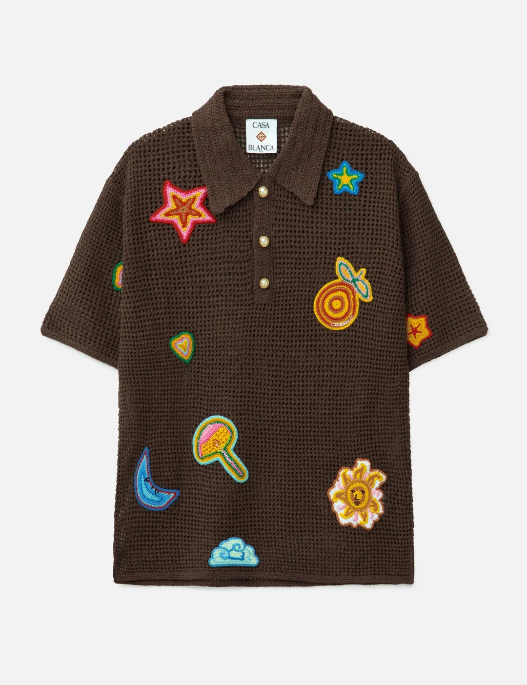 - Casablanca - Motif Crochet Polo Shirt - Crafted from knitted mercerized cotton fabric - Summer-inspired patches throughout - Button placket - Straight hem - Color: Brown - Material: 100% Mercerized Cotton - See more Polos and Clothing - Model wears size M - Model measures: Height 188cm, Chest 38”/96cm, Waist 30”/78cm, Hip 37”/94cm - Model wears size S - Model measures: Height 177cm, Chest 31.9’’/81cm, Waist 23.6’’/60cm, Hip 35.8’’/91cm - Vendor Code: MS25-KW-914-01