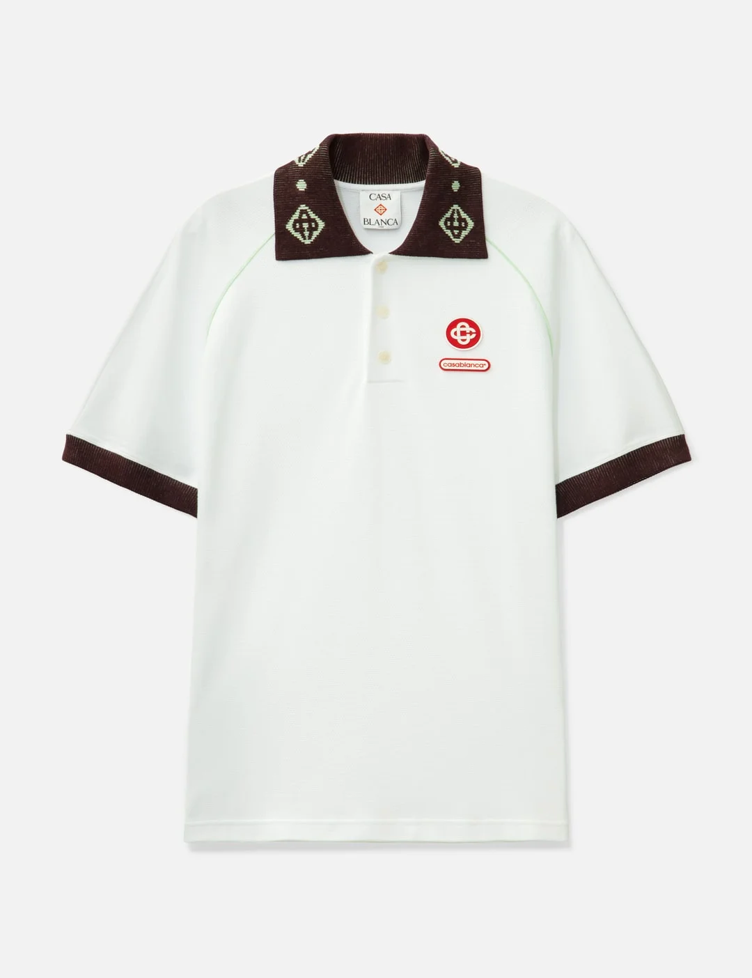 - Casablanca - Pique Polo - Relaxed fit - Standard collar with brand logos - 3-button placket - Short raglan sleeves with contrast cuffs - Straight hem - Made in Portugal - Color: White - Material: 100% Cotton - See more Polos and Clothing - Model wears size M - Model measures: Height 186cm, Chest 34”/86cm, Waist 28”/71cm, Hip 36”/91cm - Model wears size S - Model measures: Height 177cm, Chest 32”/81cm, Waist 23.5”/59.7cm, Hip 33’’/83.8cm - Vendor Code: M-AW25-JTP-435-01