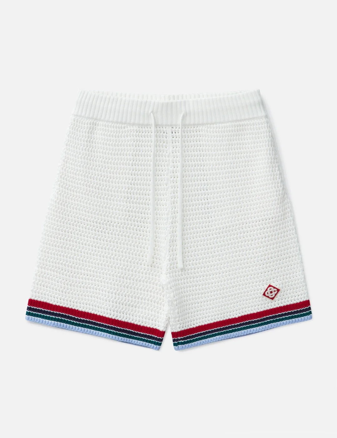 - Casablanca - Sporty Crochet Shorts - Cotton knit construction - Elasticated waistband with drawcord - Contrasting stripes at trim - Two side pockets - Color: White - Material: 100% Cotton - See more Shorts and Clothing - Model wears size M - Model measures: Height 188cm, Chest 38”/96cm, Waist 30”/78cm, Hip 37”/94cm - Model wears size S - Model measures: Height 177cm, Chest 31.9’’/81cm, Waist 23.6’’/60cm, Hip 35.8’’/91cm - Vendor Code: MS25-KW-921-01