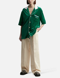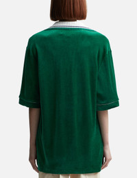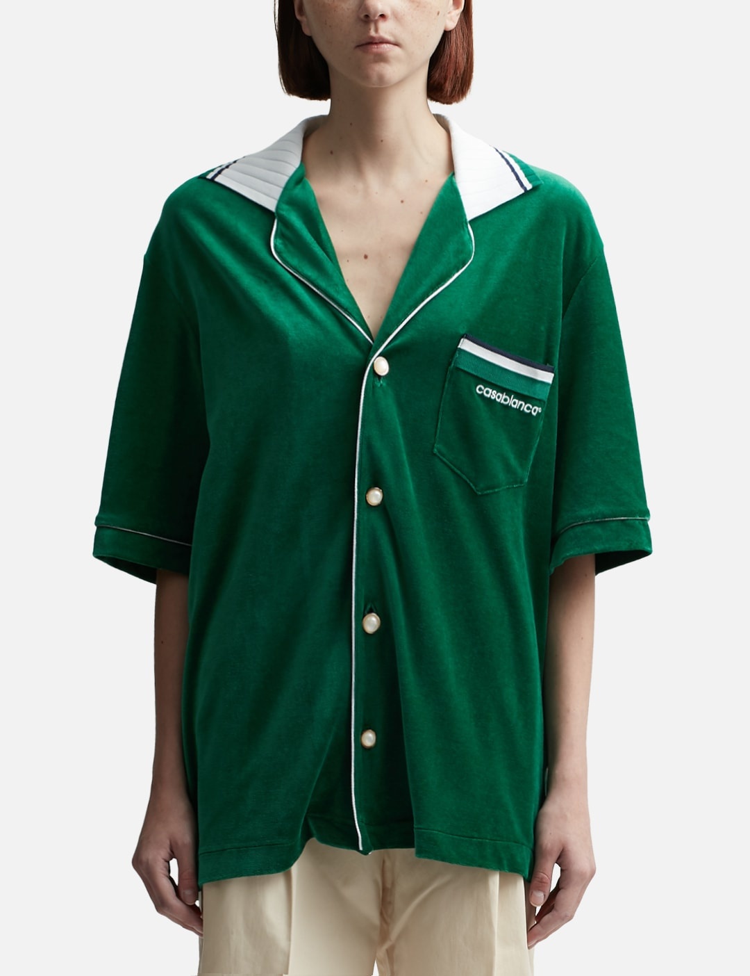 - Casablanca - Velour Shirt - Ribbed open collar - Button closure - Chest pocket with embroidered logo - Piping details throughout - Color: Evergreen - Material: 40% Cotton, 40% Modal, 20% Polyamide - See more Shirts and Clothing SIZING Male - Model wears size M - Model measures: Height 188cm, Chest 36"/92cm, Waist 30"/76cm, Hip 37"/94cm - Model wears size S - Model measures: Height 177cm, Chest 32"/81cm, Waist 23.5"/59.7cm, Hip 33’’/83.8cm