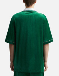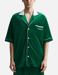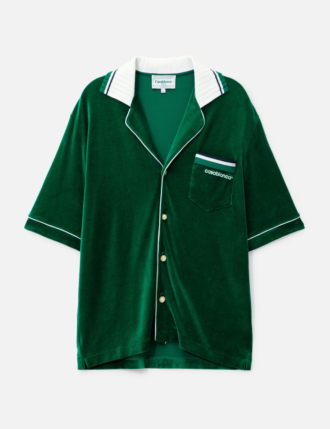 - Casablanca - Velour Shirt - Ribbed open collar - Button closure - Chest pocket with embroidered logo - Piping details throughout - Color: Evergreen - Material: 40% Cotton, 40% Modal, 20% Polyamide - See more Shirts and Clothing SIZING Male - Model wears size M - Model measures: Height 188cm, Chest 36"/92cm, Waist 30"/76cm, Hip 37"/94cm - Model wears size S - Model measures: Height 177cm, Chest 32"/81cm, Waist 23.5"/59.7cm, Hip 33’’/83.8cm