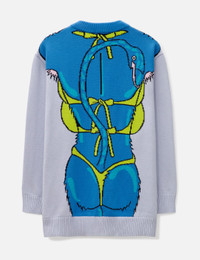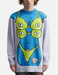 - Charles Jeffrey Loverboy - Sexy Beasts Jumper - Cotton knit jumper - All-over jacquard graphic - Ribbed neckline, cuffs, and hem - Color: Bikini Blue - Material: 100% Cotton - See more Knitwear and Clothing SIZING Male - Model wears size M - Model measures: Height 187cm, Chest 37”/96.5cm, Waist 30”/76.2cm, Hip 37”/94cm - Model wears size S - Model measures: Height 179cm, Chest 32”/81cm, Waist 23’’/58.42cm, Hip 35’’/88.9cm