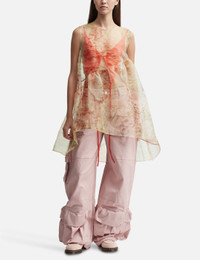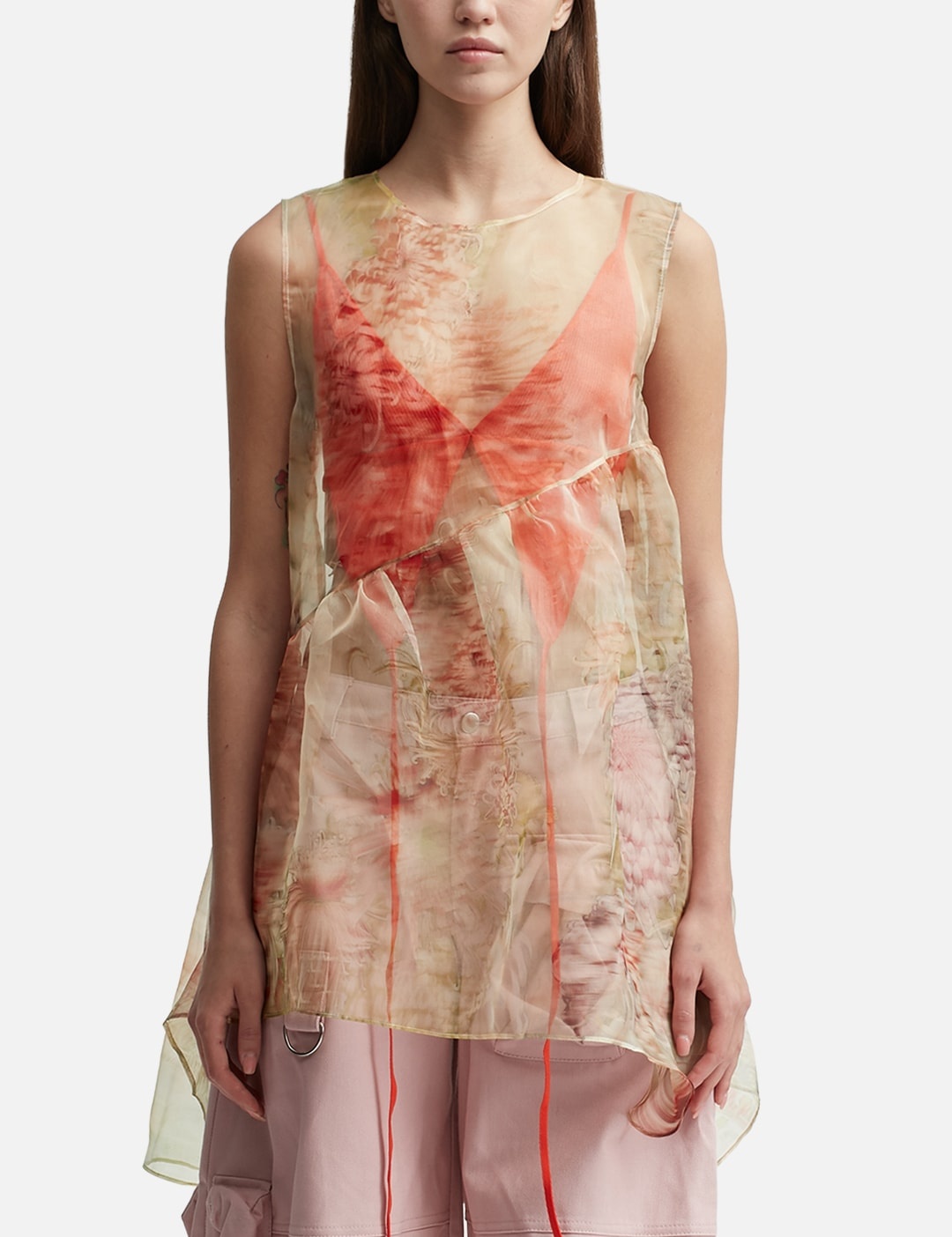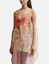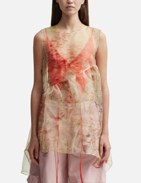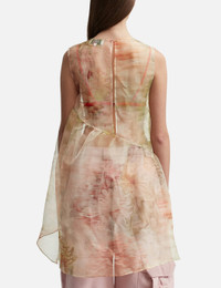 - Collina Strada - Organza Ritual Tunic Dress - Floral pattern silk dress - Sheer finish - Round neckline - Hook closure at rear neck - Deep back slit - Color: Light Chrysanthemum - Material: 100% Silk - See more Dresses and Clothing SIZING - Model wears size XS - Model measures: Height 175cm, Chest 33”/83.8cm, Waist 23”/58.4cm,Hip 34”86.4cm