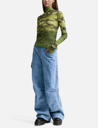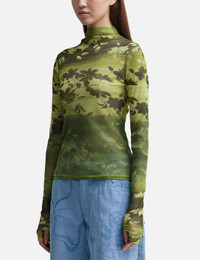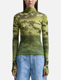- Collina Strada - Thumbtastic Top - Made from deadstock polyester - Semi-sheer mesh exterior - Raw cut mock neck - Extra long sleeves with thumb holes - Straight hem - Color: Forest Floral - Material: 95% Deadstock Polyester, 5% Spandex - See more Tops and Clothing SIZING - Model wears size XS - Model measures: Height 175cm, Chest 33”/83.8cm, Waist 23”/58.4cm,Hip 34”86.4cm