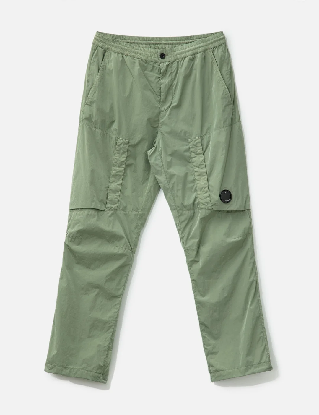 - C.P. Company - Chrome-R Lens Cargo Pants - Made in Chrome-R, a 100% recycled nylon - Shinny surface - Regular fit - Garment dyed - Adjustable drawstring waistband - Button and zip closure - Side pockets - Cargo flap snap pockets with Lens detail - Back flap snap pocket with applied label - Adjustable drawstring hems - Mesh lining - Color: Seagrass - Material: 100% Polyamide; Lining: 100% Polyamide - See more Pants and Clothing - Model wears size 48 - Model measures: Height 186cm, Chest 34”/86cm, Waist 28”/71cm, Hip 36”/91cm - Vendor Code: 19CMPA152A-005904G