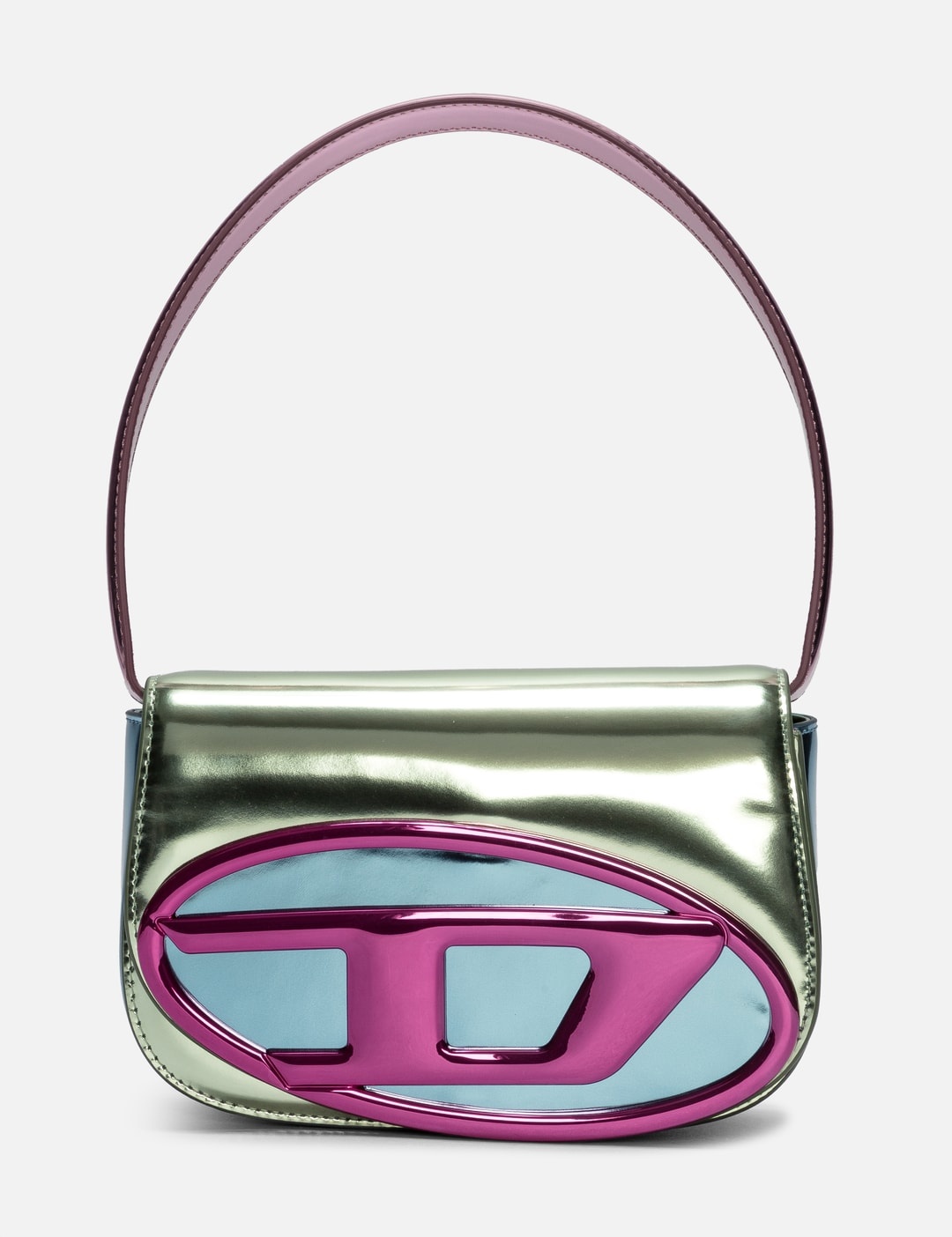 - Diesel - 1DR Bag - Iconic shoulder bag - Made from high-shine mirror leather - Color-blocked in electric hues - Bold oval d plaque - Top handle that can be folded under the bag - Detachable and adjustable strap - Magnetic flap closure - Inner slip pocket and flat compartment - Color: Green/ Pink - Material: 100% Cow Leather - See more Shoulder Bags, Bags and Accessories SIZING Approximate dimensions: - Height: 12cm - Width: 20cm - Depth: 5cm - Handle Length: 18cm