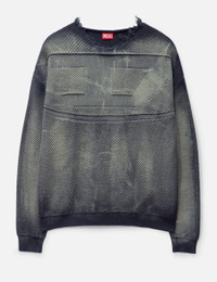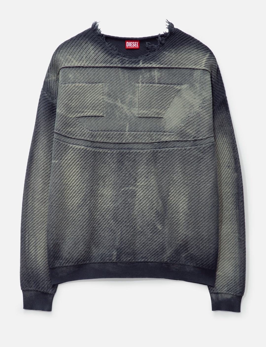 - Diesel - Frayed denim-effect jumper - Distressed denim - Treated to create a streaky faded blue hue - Loose fit - Long sleeves - Frayed neck - Ribbed cuffs and hem - Oversized jacquard oval d logo - Color: Dark Blue - Material: 100% Cotton - See more Knitwear and Clothing SIZING - Model wears size M - Model measures: Height 187cm, Chest 36”/91cm, Waist 29”/74cm, Hip 37”/94cm