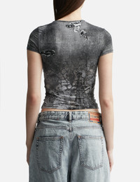 - Diesel - T-Uncski Cropped T-shirt - Body-hugging fit - Cropped - Short sleeves - Abstract design of camo influences with snakes, metal fences and tropical flowers - Trompe l'oeil distressing - Embroidered oval d logo on the back - Color: Gray - Material: 85% Polyamide-Nylon, 15% Elastane-Spandex - See more SS T-Shirts, T-Shirts and Clothing SIZING - Model wears size S - Model measures: Height 177cm, Chest 32”/81cm, Waist 24’’/61cm, Hip 35’’/88.9cm