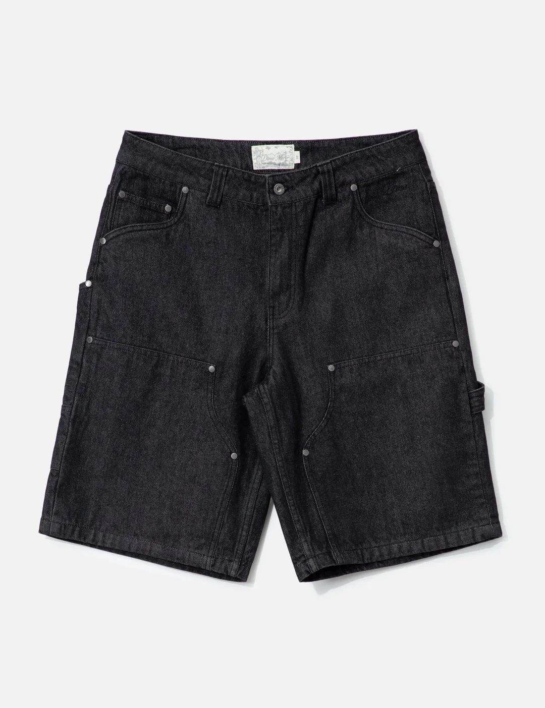 - Dime - Carpenter Denim Shorts - Zip fly - Five pockets with wavy design - Embroidered logo at front left pocket - Hammer loop and one tool pocket at sides - Rivet details all over - Double knees - Embroidered patch on back right waistband - Color: Black Washed - Material: 100% Cotton - See more Shorts and Clothing - Model wears size 32 - Model measures: Height 186cm, Chest 34”/86cm, Waist 28”/71cm, Hip 36”/91cm - Vendor Code: DIMEFA2521BLK