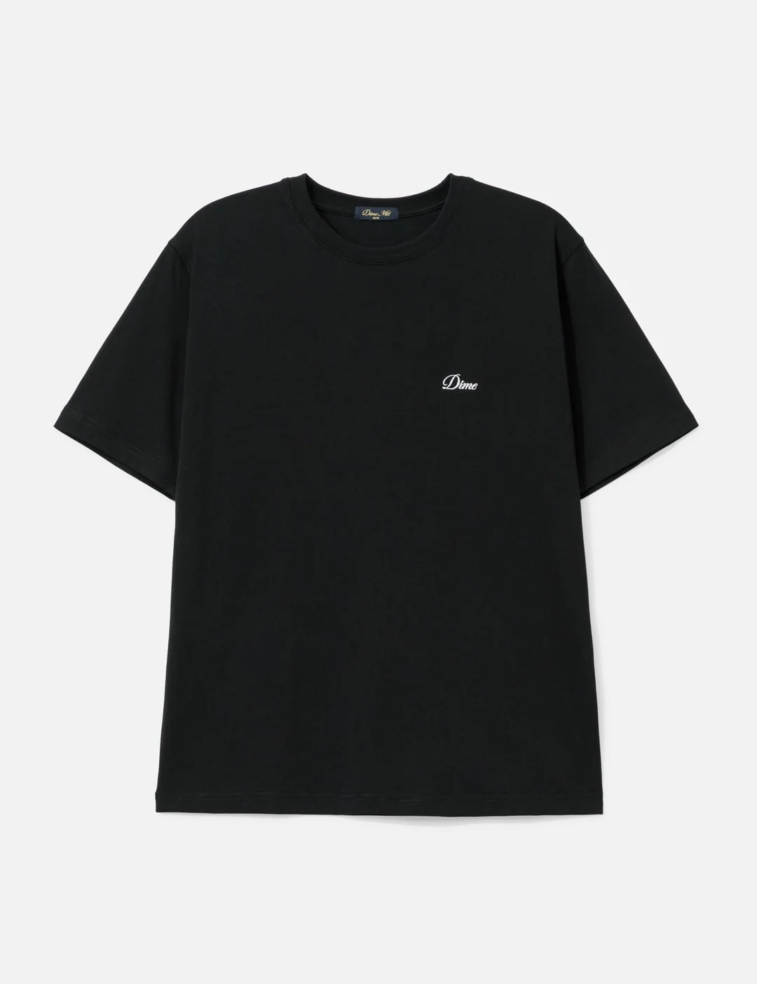 - Dime - Cursive Small Logo T-Shirt - Made of 6.5oz cotton - Pre-shrunk - Ribbed crewneck - Short sleeves - Embroidered logo at chest - Color: Black - Material: 100% Cotton - See more SS T-Shirts, T-Shirts and Clothing - Model wears size M - Model measures: Height 186cm, Chest 34”/86cm, Waist 28”/71cm, Hip 36”/91cm - Vendor Code: DIMEHO2547BLK