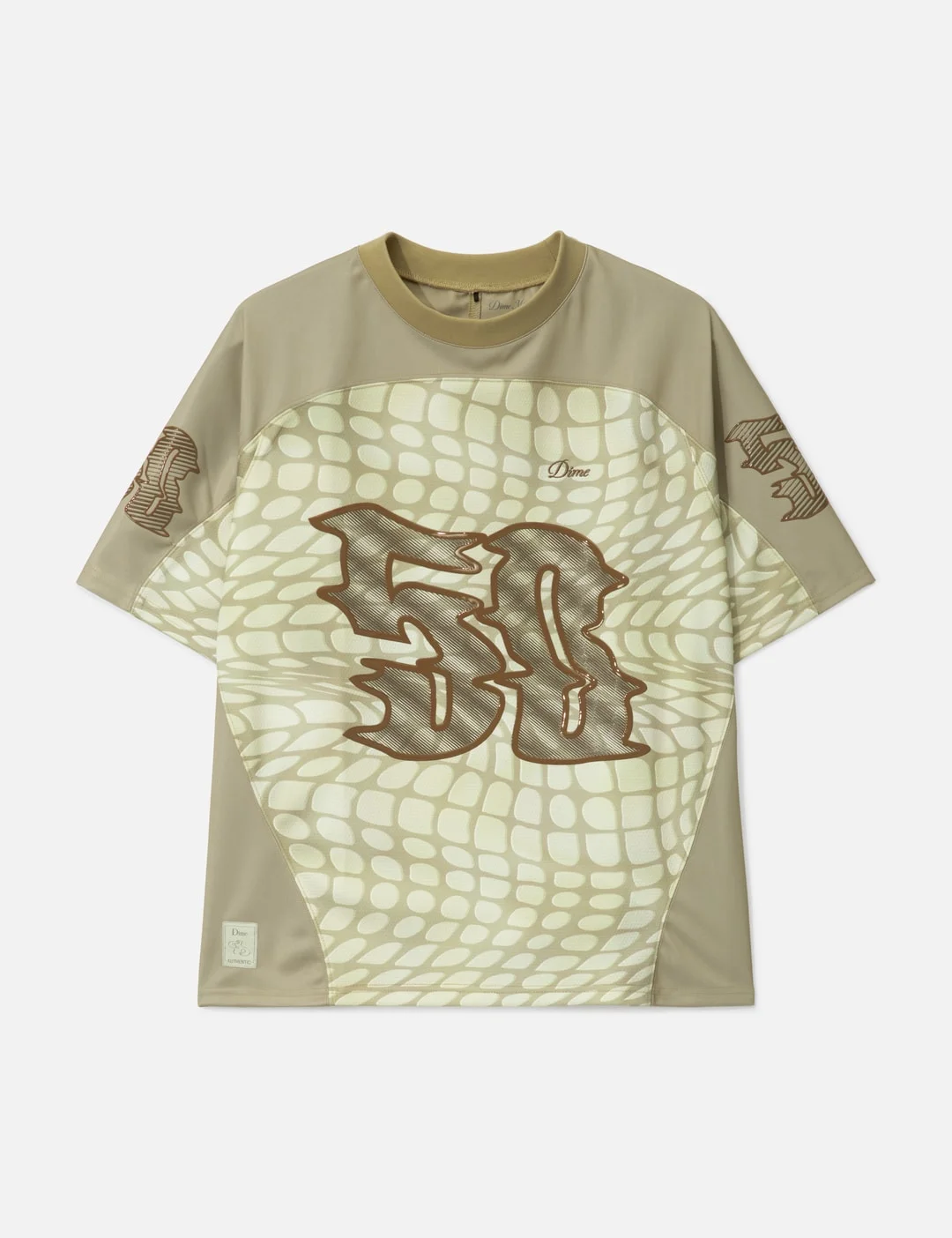 - Dime - N50 Jersey - Made with polyester - Ribbed crewneck - Patchwork of satin fabric on shoulder and side seam - Wavy croc pattern on front and back - Embroidered brand logo on left chest - Silicone print on front and sleeves - Woven brand label at bottom right hem - Color: Taupe - Material: 100% Polyester - See more SS T-Shirts, T-Shirts and Clothing - Model wears size M - Model measures: Height 186cm, Chest 34”/86cm, Waist 28”/71cm, Hip 36”/91cm - Vendor Code: DIMEFA256TAU