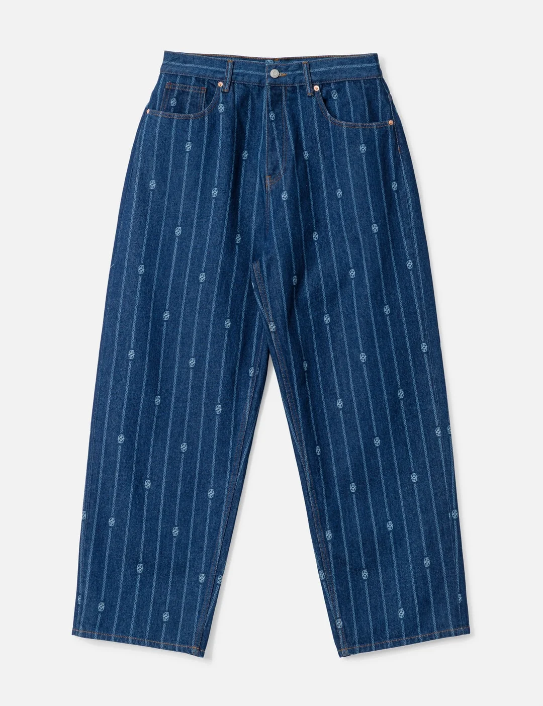 - Drole de Monsieur - Le Jean Baggy Monogramme - Oversized fit - Low waist - Button fly - Tresse Monogramme stripes all over - Engraved rivets on the front pockets - Engraved denim button - 5-pocket - Leather patch on the back - Made in Portugal - Color: Stone Wash - Material: 100% Cotton - See more Jeans and Clothing - Model wears size M - Model measures: Height 186cm, Chest 34”/86cm, Waist 28”/71cm, Hip 36”/91cm - Vendor Code: I-BP168-CO238-SW