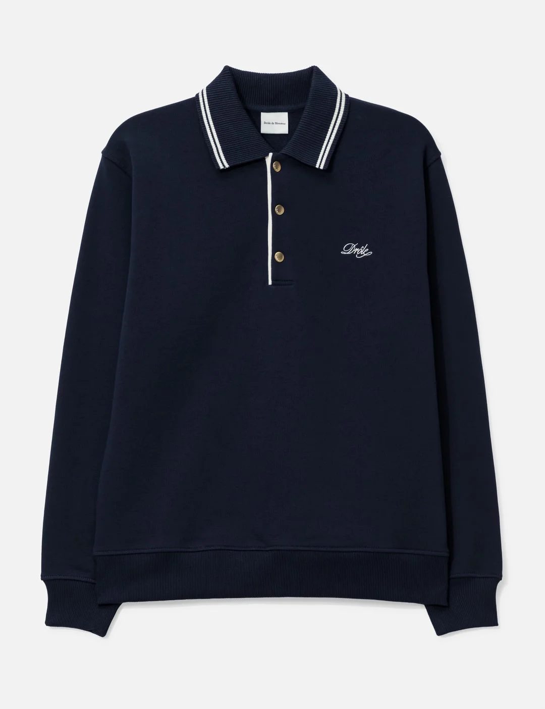 - Drole de Monsieur - Polo Drole - Made of cotton fleece fabric - Engraved snapped button tab - Striped and ribbed collar - Long sleeve - Contrast 'Drole' embroidery on chest - Ribbed collar, cuffs, and hem - Color: Navy - Material: 100% Cotton - See more Polos and Clothing - Model wears size M - Model measures: Height 189cm, Chest 33”/84cm, Waist 27”/68.6cm, Hip 36”/91.4cm - Vendor Code: J-PL132-CO127-NY