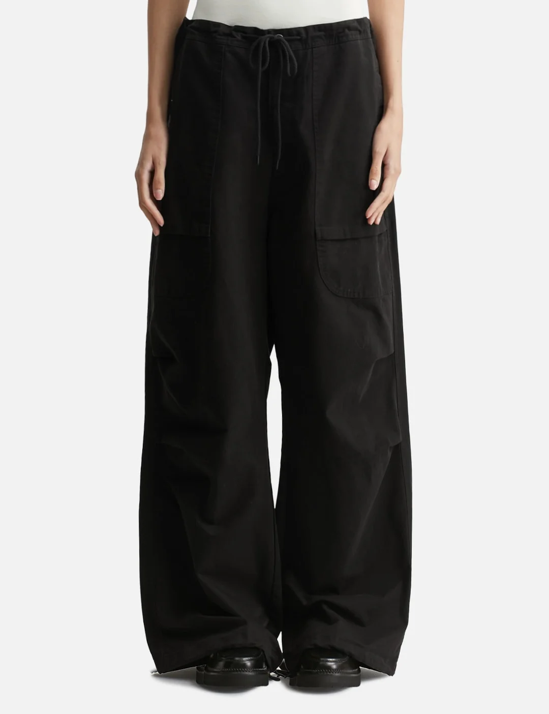 - Entire Studios - Barren Cargo - Made of 310gsm organic cotton twill - Drawstring waistband - Zip fly - Wide legs - Two side pockets - Back flap pockets - Pleat details on knees - Adjustable cuffs - Color: Black - Material: 100% Cotton - See more Pants and Clothing - Model wearing size S - Model measures: Height 179cm, Chest 32’’/ 81.3cm, Waist 24.5”’/62cm, Hip 34.5’’/88cm - Vendor Code: UNU-25-3009-BL