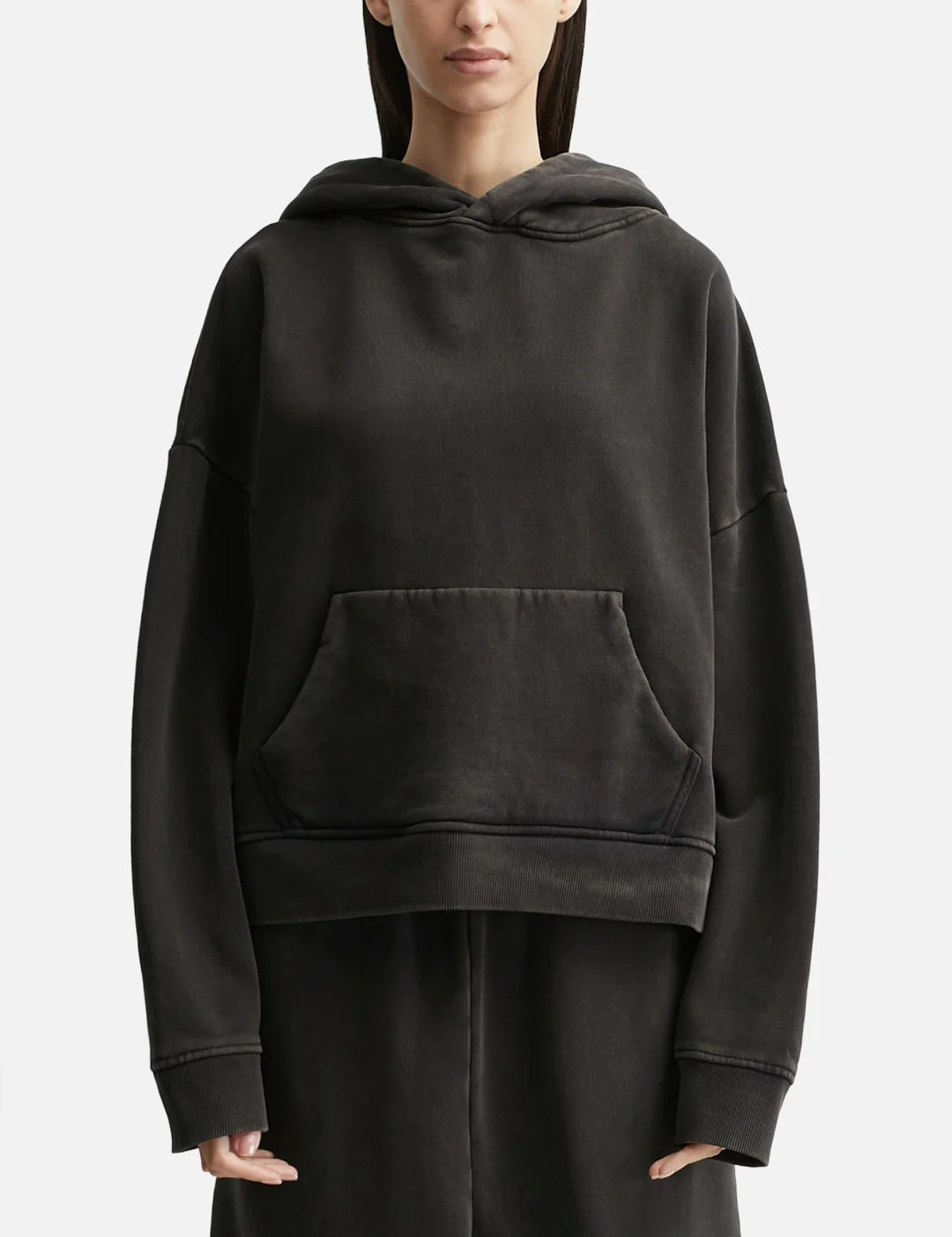 - Entire Studios - Heavy Hood - Made of 510gsm organic cotton brushed back fleece - Garment-dyed - Enzyme-washed - Fixed hood - Drop shoulder - Long sleeves - Front kangaroo pocket - Ribbed cuffs and hem - Colors may vary due to the wash process - Color: Washed Black - Material: 100% Cotton - See more Hoodies and Clothing - Model wearing size XS - Model measures: Height 179cm, Chest 32’’/ 81.3cm, Waist 24.5”’/62cm, Hip 34.5’’/88cm - Vendor Code: UNU-25-1012-WB
