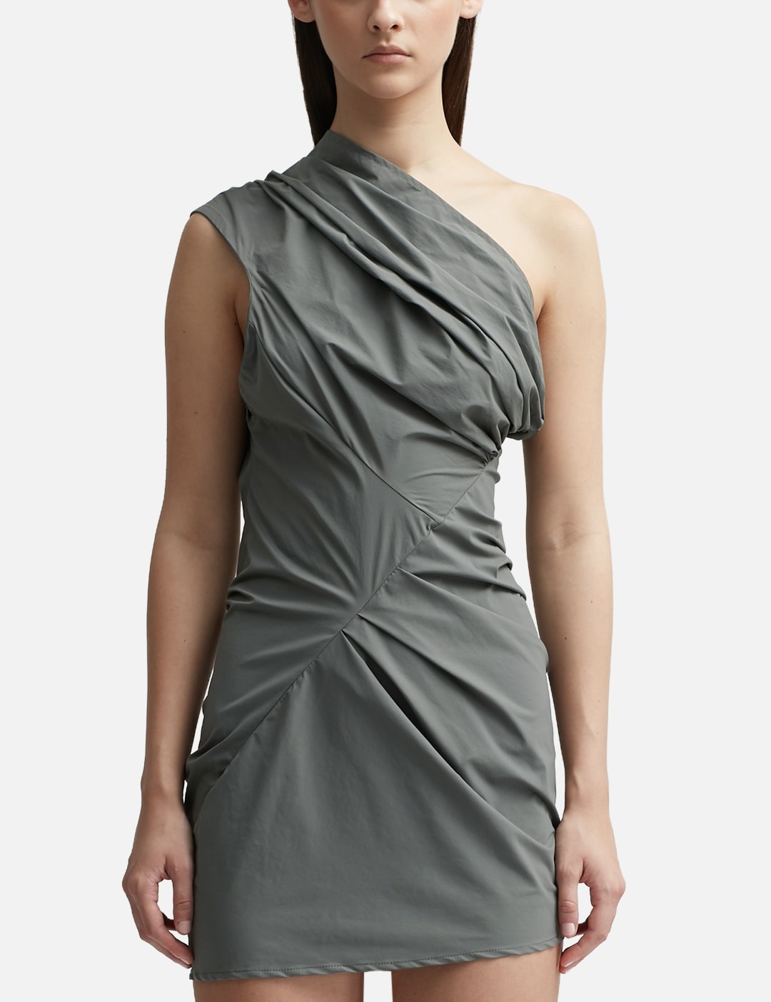 - Entire Studios - Mini Pillar Dress Nylon - One shoulder design - Gathered front - Asymmetric hem - Mini-length - Color: Rock - Material: 95% Nylon, 5% Elastane - See more Dresses and Clothing SIZING - Model wears size XS - Model measures: Height 179cm, Chest 33”/83cm, Waist 24.8”/63cm,Hip 35’’/89cm