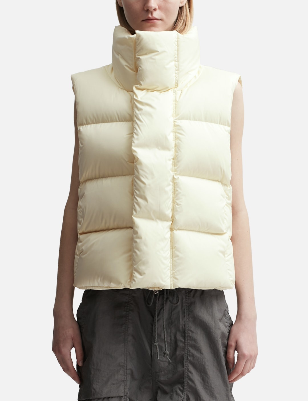 - Entire Studios - MML Vest - Lightweight polyester shell - Filled with ethically sourced down - Concealed velcro closure - Side pockets - Drawcord hem - Color: Cream - Material: Outer: 100% Polyester; Filling: 90% Duck Down, 10% Feather - See more Vests and Clothing SIZING Male - Model wears size M - Model measures: Height 187cm, Chest 36”/91cm, Waist 28”/72cm, Hip 36”/91cm - Model wears size S - Model measures: Height 179cm, Chest 32”/81cm, Waist 23’’/58.42cm, Hip 35’’/88.9cm