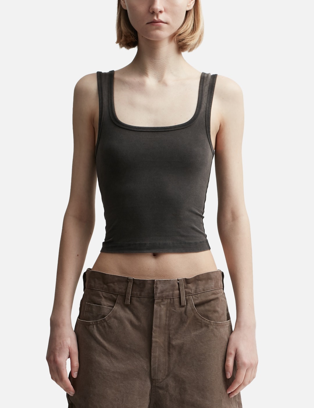 - Entire Studios - Square Neck Tank Top - Stretch cotton fabric - Slim fit - Square neckline - Due to the special wash process colors may slightly vary for each product - Color: Washed Black - Material: 90% Cotton, 10% Elastane - See more Vests and Clothing SIZING - Model wears size XS - Model measures: Height 179cm, Chest 32”/81cm, Waist 23’’/58.42cm, Hip 35’’/88.9cm