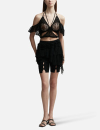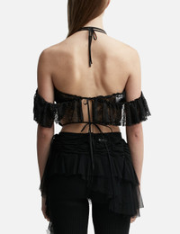 - ESTER MANAS - Butterfly Top - Slim fit - Off-shoulder sleeves - V-neckline - Cropped cut - Semi-sheer lace fabric - Cut-out details - Ruching throughout - Color: Black - Material: 95% Polyester, 5% Elastane - See more Tops and Clothing SIZING - Model wears Free Size - Model measures: Height 181cm, Chest 33”/84cm, Waist 24”/61cm, Hip 35”/90cm