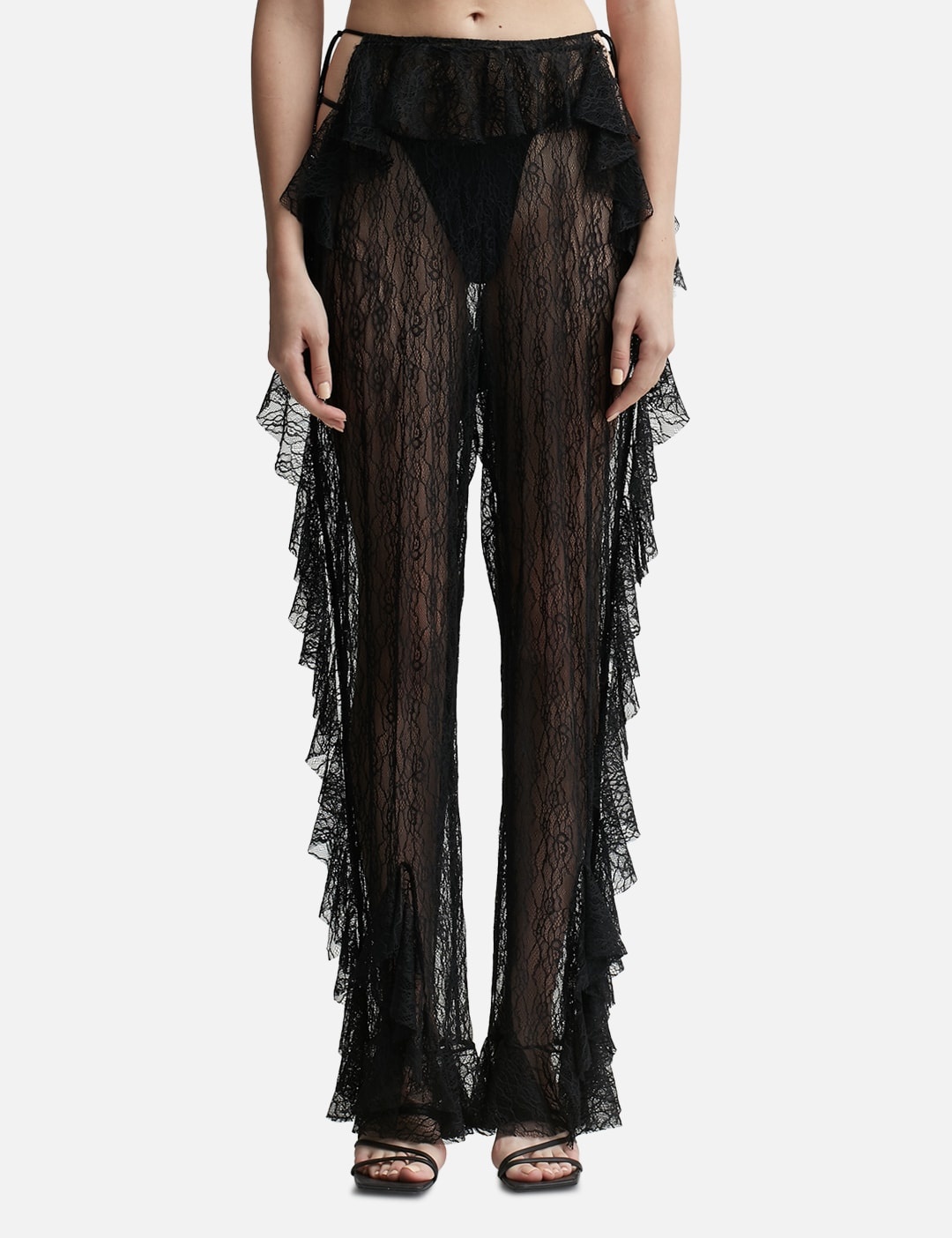 - ESTER MANAS - Mermaid Lace Ruffled Pants - Relaxed fit - Semi-sheer lace fabric - Elasticated waist - Cut-out details at waist - Tie string fastening - Ruffle details along sides - Color: Black - Material: 95% Polyester, 5% Elastane - See more Pants and Clothing SIZING - Model wears Free Size - Model measures: Height 181cm, Chest 33”/84cm, Waist 24”/61cm, Hip 35”/90cm