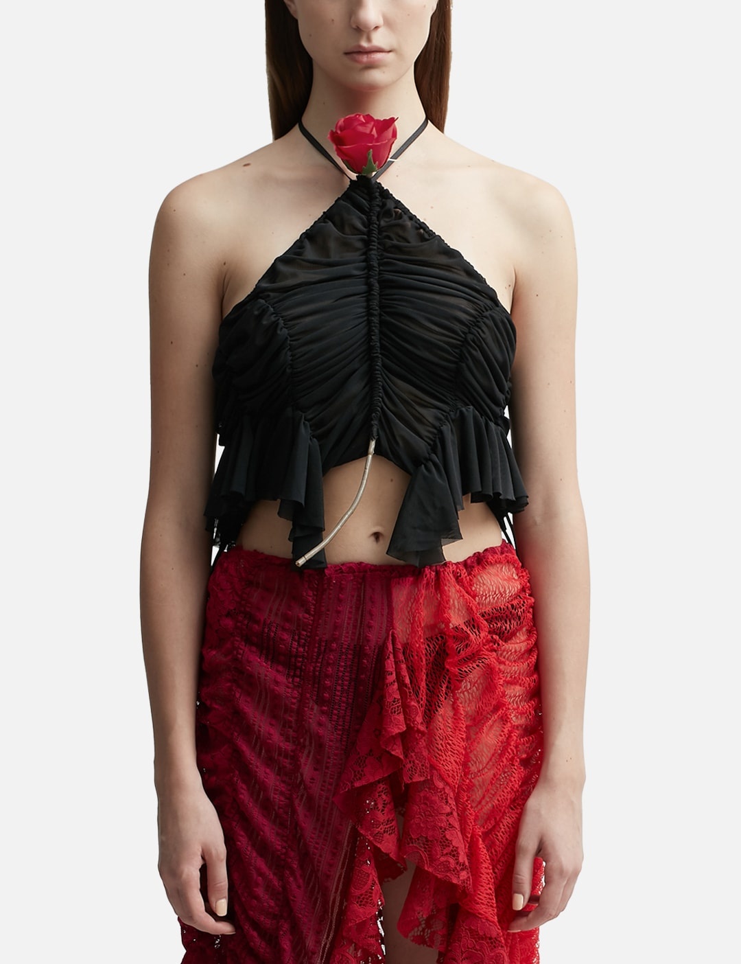 - ESTER MANAS - Mini Flower Ruched Tank Top - Close fit - Cropped cut - Off-shoulder - Sleeveless - Halter neck - Self-tie fastening - Stretchy fabric - Ruched throughout - Flower detail on collar - Color: Brown - Material: 82% Polyamide, 18% Elastane - See more Tops and Clothing SIZING - Model wears Free Size - Model measures: Height 181cm, Chest 33”/84cm, Waist 24”/61cm, Hip 35”/90cm