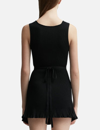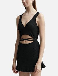 - ESTER MANAS - Mini Peephole Knit Dress - Mini-length - Slim fit - Sleeveless - Rib knit - Stretchy fabric - Self-tie fastening - Cut-out detiails - Frilled hem - Color: Black - Material: 65% Cotton, 35% Nylon - See more Dresses and Clothing SIZING - Model wears Free Size - Model measures: Height 181cm, Chest 33”/84cm, Waist 24”/61cm, Hip 35”/90cm