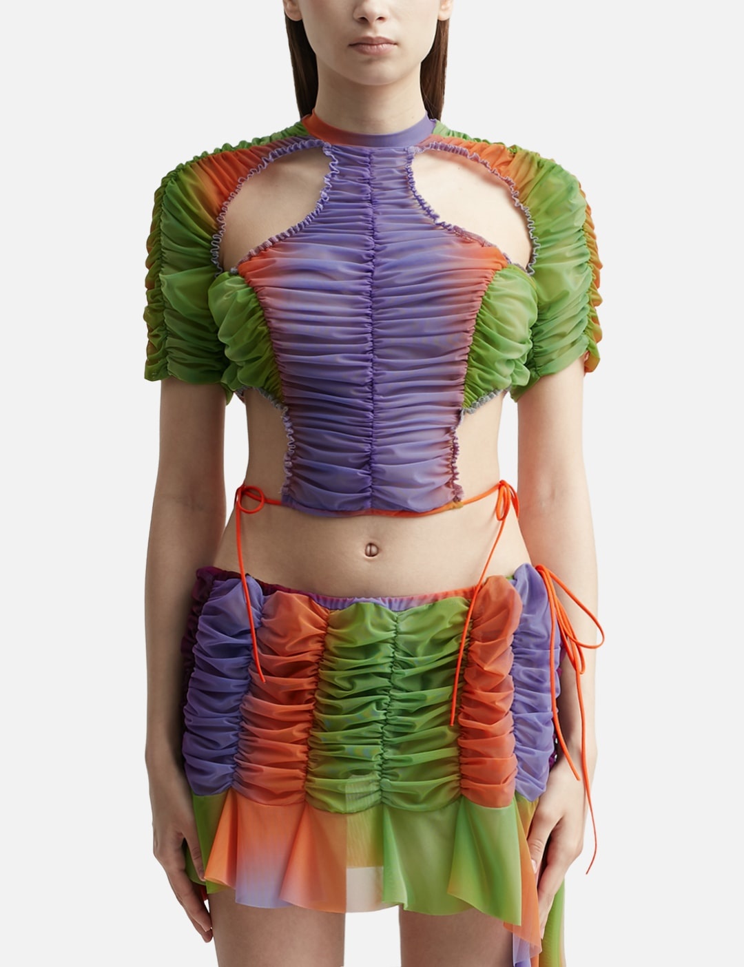 - ESTER MANAS - Signature Ruched Crop Top - Semi-sheer stretch nylon mesh construction - Ruching, cutouts and ruffled detailing throughout - Mock neck - Self-tie straps at hem - Color: Sunset - Material: 82% Polyamide, 18% Elastane - See more Tops and Clothing SIZING - Model wears size 34/44 - Model measures: Height 176cm, Chest 32”/81cm, Waist 23”/59cm, Hip 35”/90cm