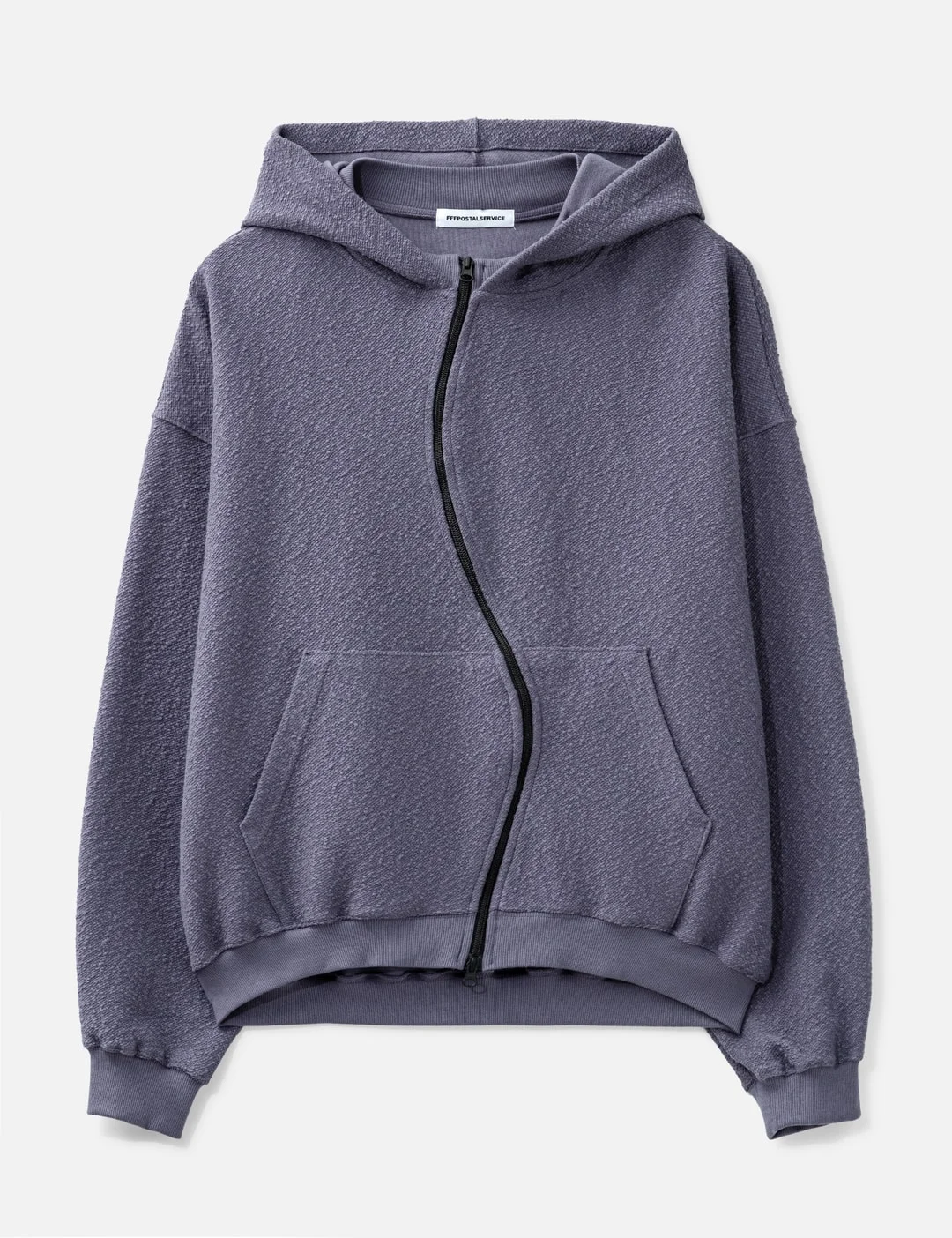 - FFFPostalservice - Curved Zip-Up Round Hem Hoodie - French terry cotton fabric - Frayed, faded details - Integrated hood - Signature curved zip closure - Two side pockets - Ribbed cuffs and hem - Color: Ghost Lilac - Material: 100% Cotton - See more Hoodies and Clothing - Model wears size L - Model measures: Height 186cm, Chest 34”/86cm, Waist 28”/71cm, Hip 36”/91cm - Vendor Code: FFFPSFW2530