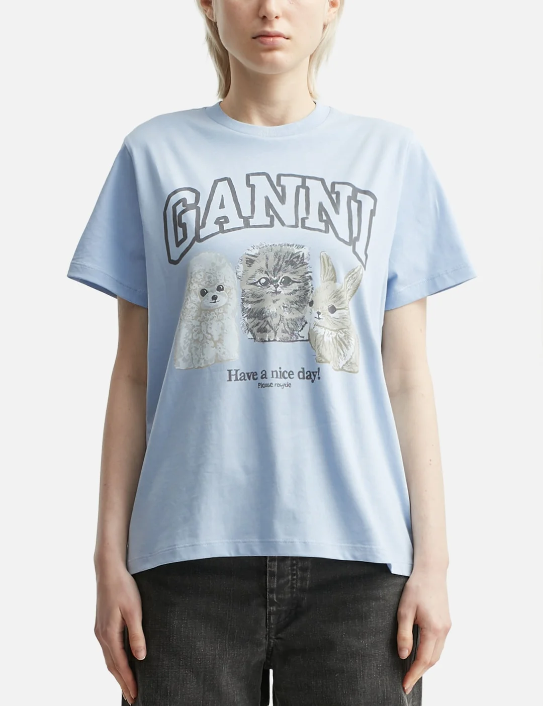 - Ganni - Animal Print T-shirt - Relaxed fit - Ribbed crewneck - Short sleeves - Animal graphic prints - GANNI logo - 'Have a nice day! Please recycle!' message - Color: Chambray Blue - Material: 100% Organic Cotton - See more SS T-Shirts, T-Shirts and Clothing - Model wears size S - Model measures: Height 177cm, Chest 31.9’’/81cm, Waist 23.6’’/60cm, Hip 35.8’’/91cm - Vendor Code: T4278