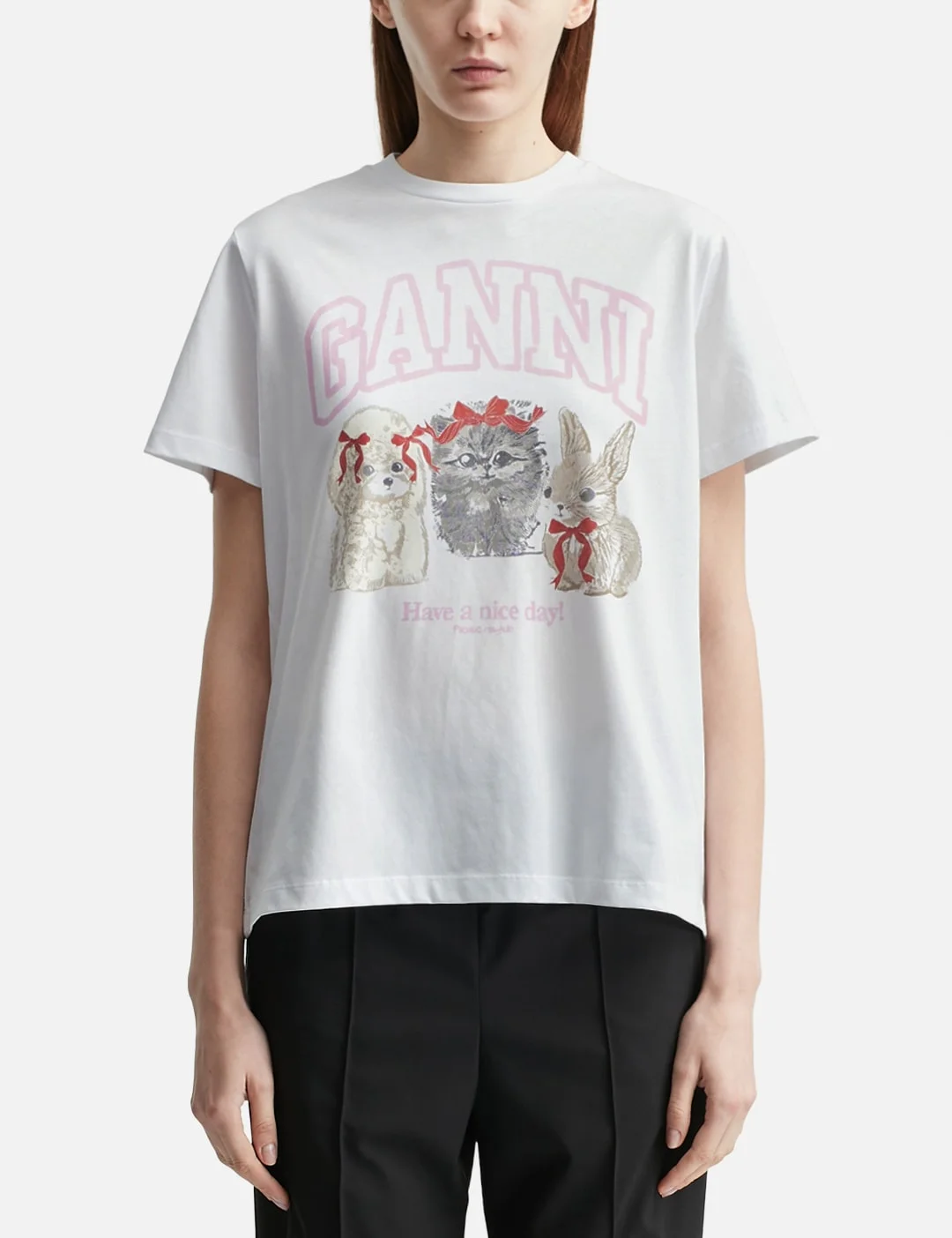 - Ganni - Animals Print T-Shirt - Made of organic cotton - Relaxed fit - Ribbed crewneck - Short sleeves - Animal print graphic on the front - GANNI logo - Made in Portugal - Color: Bright White - Material: 100% Cotton - See more SS T-Shirts, T-Shirts and Clothing - Model wears size S - Model measures: Height 180cm, Chest 30.7’’/78cm, Waist 24’’/61cm, Hip 34.8’’/88.5cm - Vendor Code: A1050029