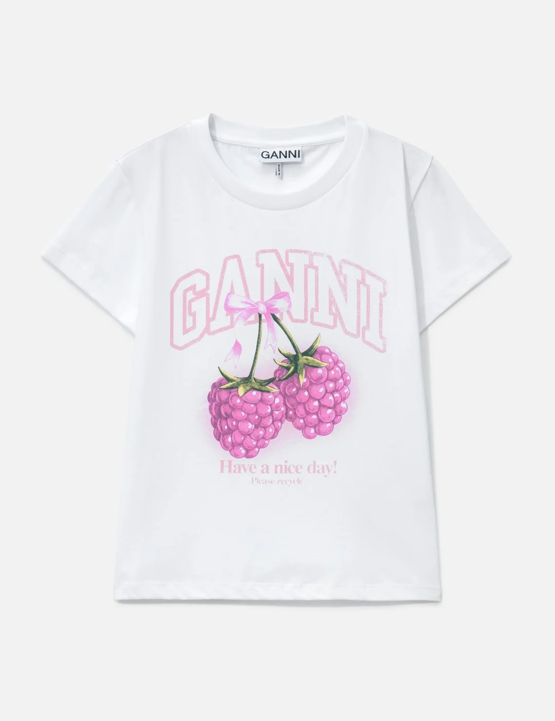 - Ganni - Baby Fit T-shirt with Raspberry - Made of organic cotton - Ribbed crewneck - Short sleeves - Raspberry graphic print and brand logo on front - Color: Bright White - Material: 100% Organic Cotton - See more SS T-Shirts, T-Shirts and Clothing - Vendor Code: A1050185
