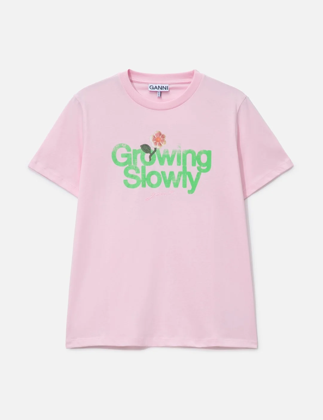 - Ganni - Basic Cotton Jersey Growing Slowly - Made of organic cotton - Ribbed crewneck - Short sleeves - Shinny graphic print on front - Embroidered Ganni logo - Color: Chalk Pink - See more SS T-Shirts, T-Shirts and Clothing - Vendor Code: A1050191
