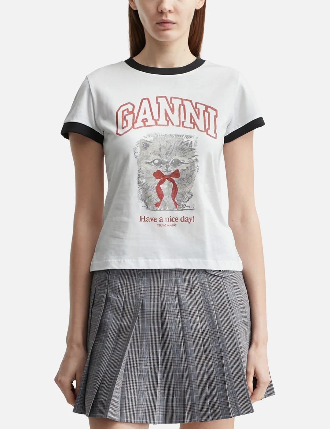 - Ganni - Cropped Kitty T-Shirt - Made of organic cotton - Slim fit - Crewneck - Short sleeves - Kitty print graphic on the front - GANNI logo - Contrast ribbing - Made in Portugal - Color: Bright White - Material: 100% Cotton - See more SS T-Shirts, T-Shirts and Clothing - Model wears size S - Model measures: Height 180cm, Chest 30.7’’/78cm, Waist 24’’/61cm, Hip 34.8’’/88.5cm - Vendor Code: A1050030