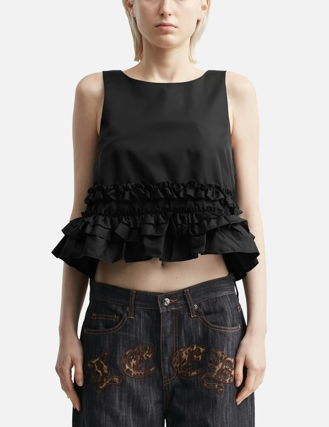 - Ganni - Duchesse Nylon Frill Top - Slim fit - U-neckline - Sleeveless - Open back - Adjustable back tie closure - Ruffled hem - Color: Black - Material: 93% Recycled Polyamide, 7% Polyurethane - See more Tops and Clothing - Model wears size 34 - Model measures: Height 177cm, Chest 31.9’’/81cm, Waist 23.6’’/60cm, Hip 35.8’’/91cm - Vendor Code: W0564