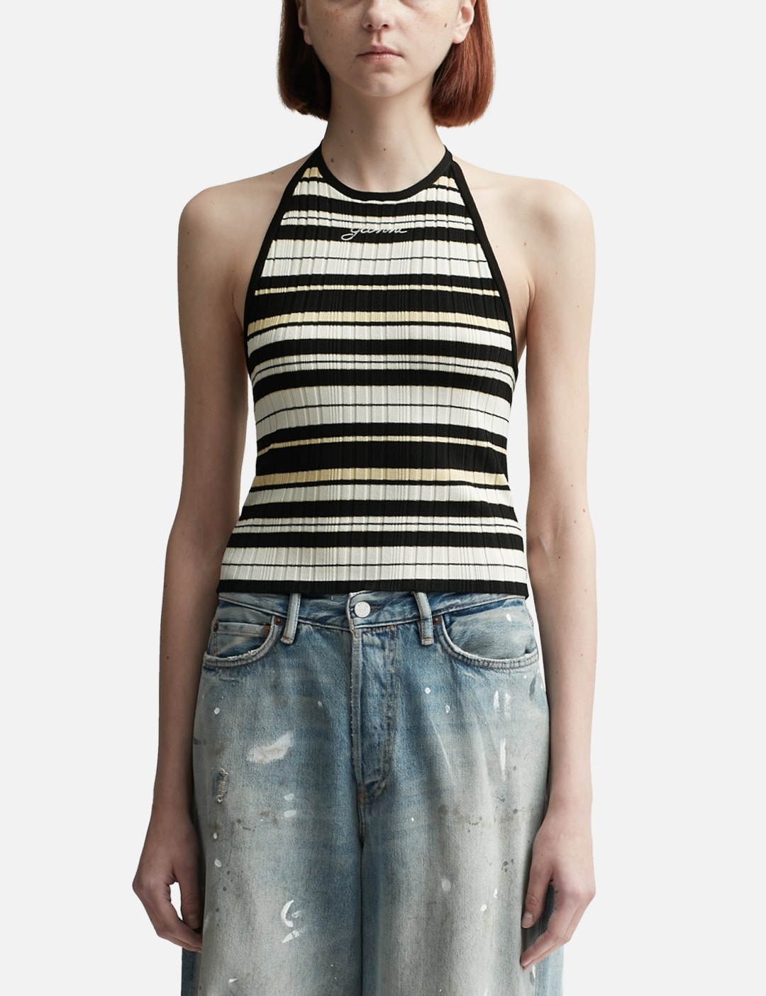 - Ganni - Future Rib Halterneck Top - Color mixed design - Viscose with CIRCULOSE® material - Halter neckline with tie bands - Brand logo embroidered at the front middle chest - Open back - Color: Multicolor - Material: 55% Viscose (with CIRCULOSE®), 43% Polyamide, 2% Elastane - See more Tops and Clothing SIZING - Model wears size S - Model measures: Height 177cm, Chest 32”/81cm, Waist 23.5”/59.7cm, Hip 33’’/83.8cm