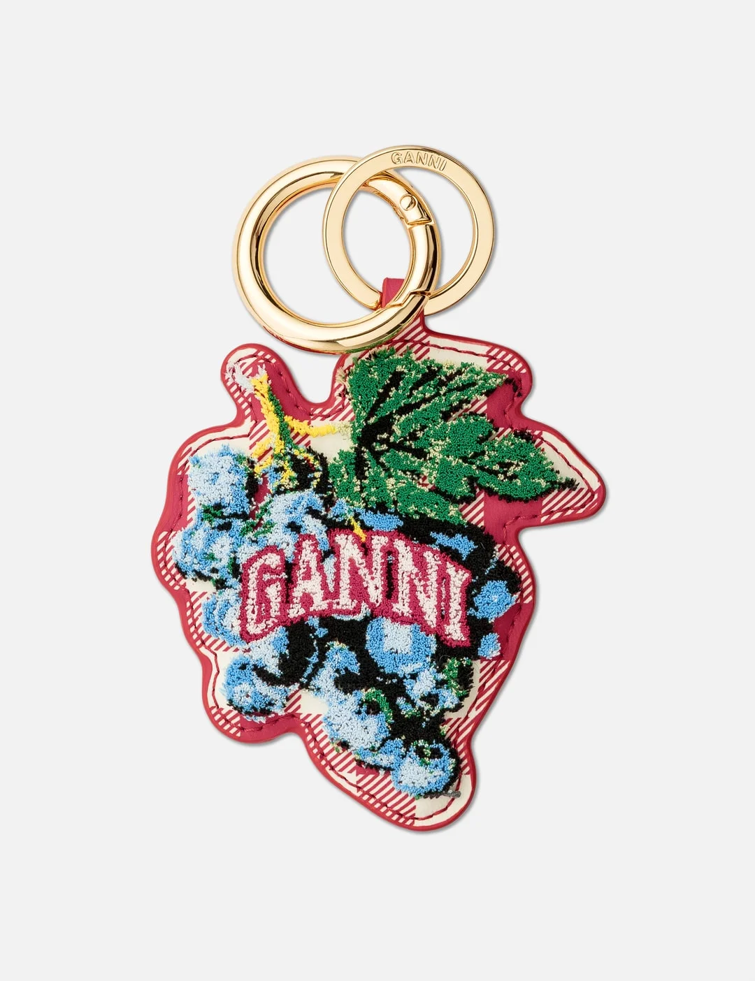 - Ganni - Grape Keyring - Shape of a grape - Gold-tone ring and clasp - GANNI logo - Color: Red Alert - Material: 65% Recycled Leather, 19% Polyurethane Fibre, 16% Polyester - See more Keychains, Jewelry and Accessories - 14cm x 8cm - Vendor Code: A6810