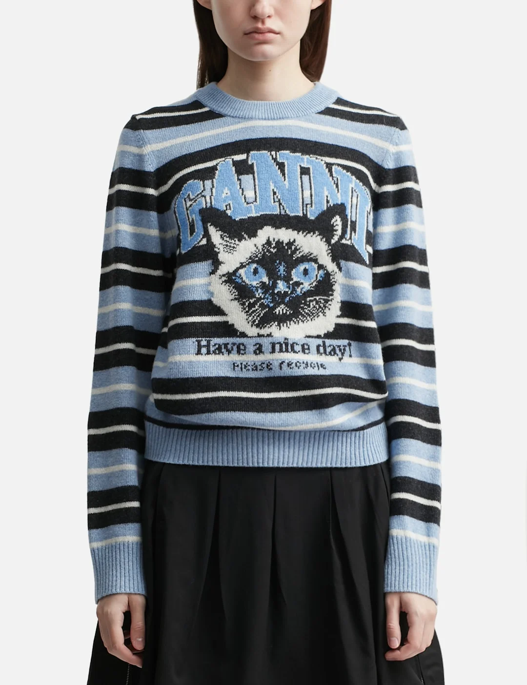 - Ganni - Graphic Wool Jumper - Made with recycled material - Crewneck - Long sleeves - Front graphic - GANNI logo - 'Have a nice day! Please recycle' message - Straight hem - Ribbed cuffs and hem - Color: Soft Chambray - Material: 45% Wool, 35% Recycled Wool, 20% Recycled Polyamide - See more Knitwear and Clothing - Model wears size S - Model measures: Height 180cm, Chest 28.3’’/72cm, Waist 22’’/56cm, Hip 35’’/89cm - Vendor Code: A1070266