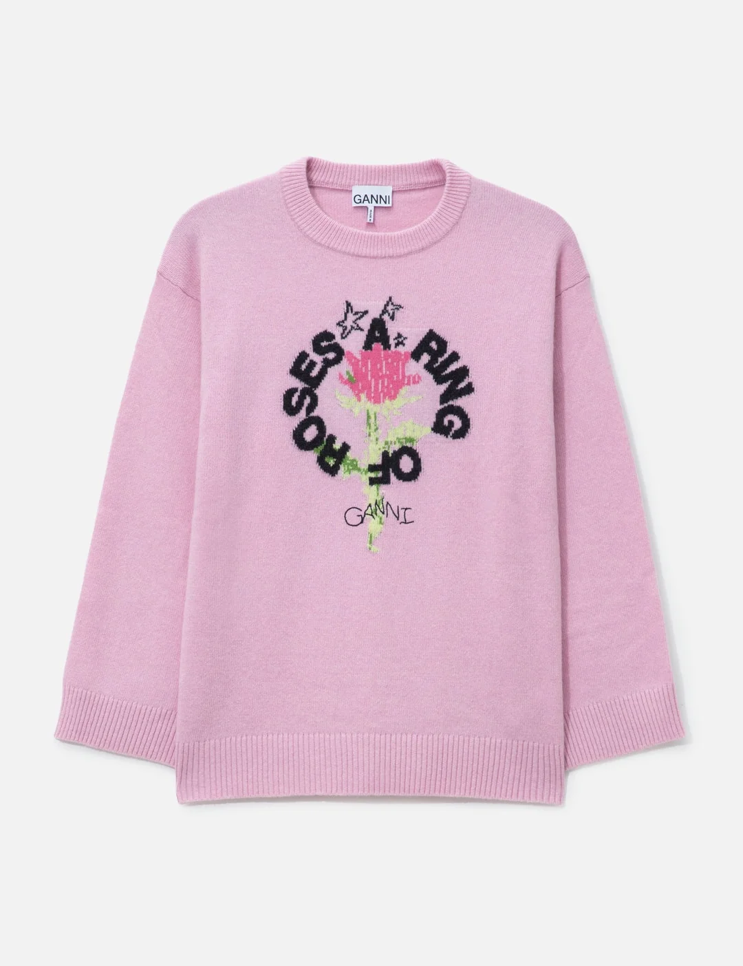 - Ganni - Graphic Wool Oversized Crewneck - Made of wool and polyamide - Oversized fit - Ribbed crewneck, cuffs and hem - Knitted graphics and brand logo on front - Color: Chalk Pink - Material: 45% Wool, 35% Recycled Wool, 20% Polyamide - See more Knitwear and Clothing - Vendor Code: A1070271
