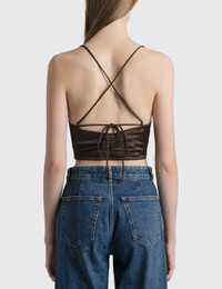 - Ganni - Lace Mix Top - Slim fit - Snap button closure at front - Adjustable cross-back tie closure - V-Neckline - Ruching at front and rear - Color: Mole - Material: 97% Recycled Polyester, 3% Elastane - See more Tops and Clothing SIZING - Model wears size S - Model measures: Height 181cm, Chest 33”/84cm, Waist 24”/61cm, Hip 35”/90cm