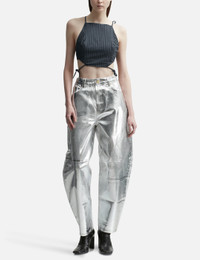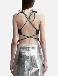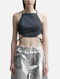 - Ganni - Stretch Stripe String Top - Slim fit - Open back - Adjustable tie strings - Color: Gray Pinstripe - Material: 62% Recycled Polyester, 32% Viscose, 6% Elastane - See more Tops and Clothing SIZING - Model wears size S - Model measures: Height 175cm, Chest 31”/79cm, Waist 24”/62cm,Hip 35’’/89cm