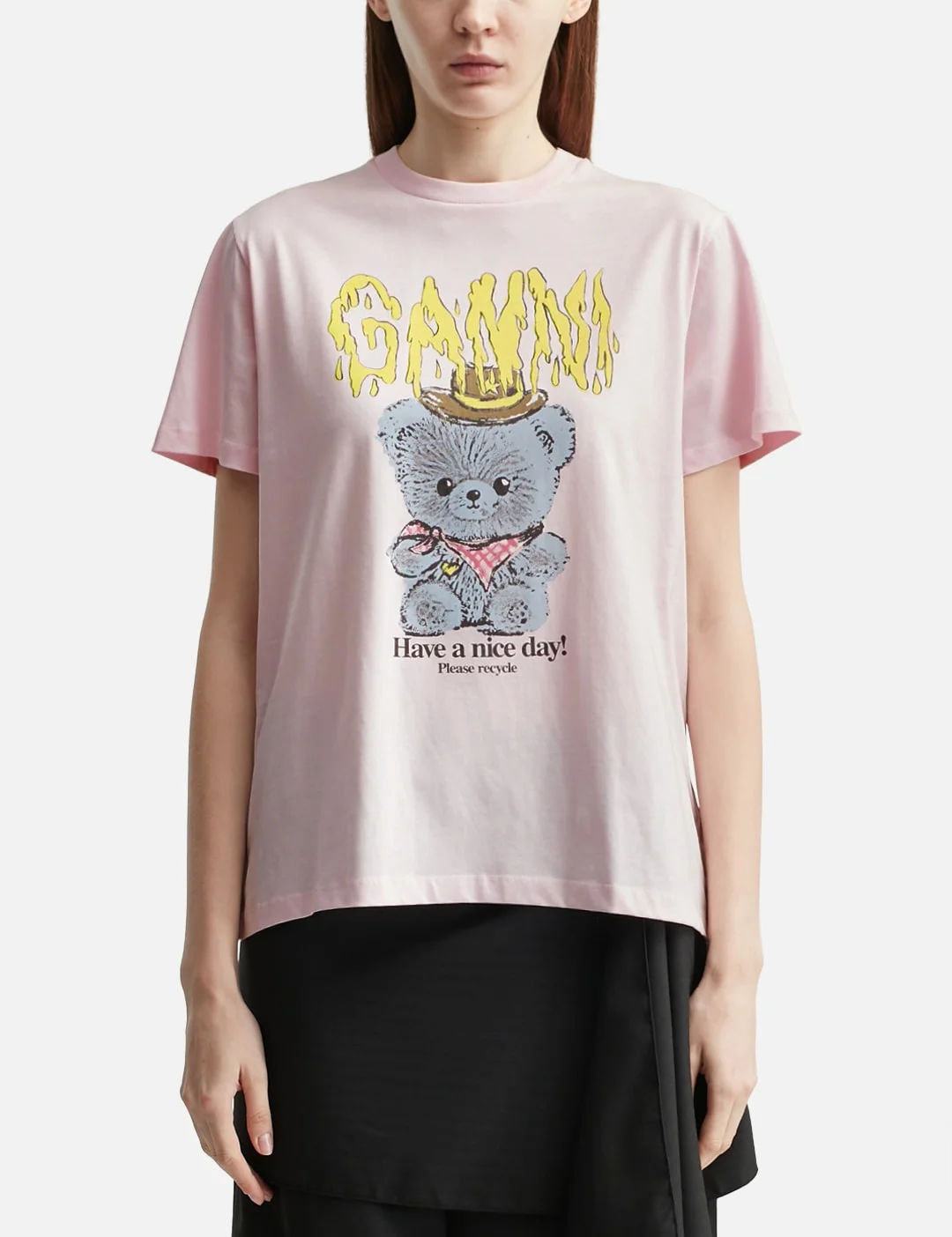 - Ganni - Teddy Cotton Jersey T-Shirt - Made of organic cotton - Relaxed fit - Ribbed crewneck - Short sleeves - Teddy bear print graphic on the front - GANNI logo - Straight hem - Made in Portugal - Color: Chalk Pink - Material: 100% Cotton - See more SS T-Shirts, T-Shirts and Clothing - Model wears size S - Model measures: Height 180cm, Chest 30.7’’/78cm, Waist 24’’/61cm, Hip 34.8’’/88.5cm - Vendor Code: A1050074