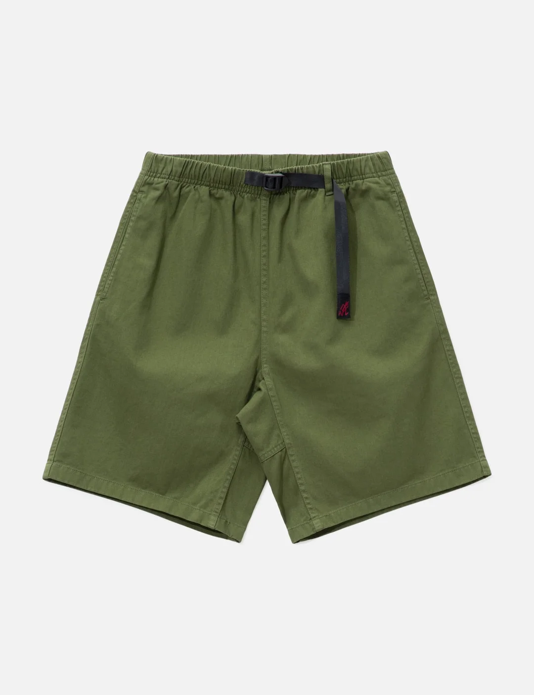 - Gramicci - G-Short - Relaxed fit - Made of eco-cotton - Hard-wearing twill fabric - Elastic waistband with integrated buckled belt - Brand label at belt tip and hem - Zip fly - Two side slant pockets - Diamond-shaped crotch gusset - Two back welt pockets with brand label - Color: Olive - Material: 100% Cotton - See more Shorts and Clothing - Model wears size M - Model measures: Height 186cm, Chest 34”/86cm, Waist 28”/71cm, Hip 36”/91cm - Vendor Code: G101-OGT
