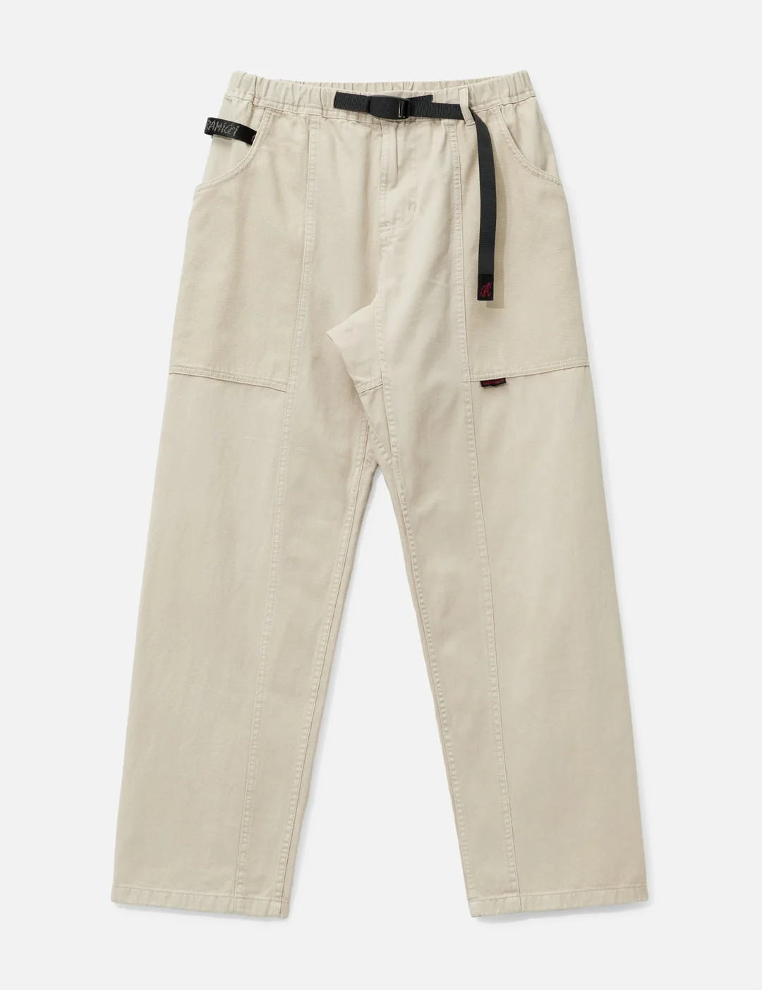 - Gramicci - Gadget Pant - Tapered fit - Low rise - Made of eco-cotton - Washed twill fabric - Elastic waistband with integrated buckled belt - Brand label at belt tip and thigh - Zip fly - Diamond-shaped crotch gusset - Two large wrap-around pockets - Nylon strap details at right pocket - Color: Sand Pigment - Material: 100% Cotton - See more Pants and Clothing - Model wears size M - Model measures: Height 186cm, Chest 34”/86cm, Waist 28”/71cm, Hip 36”/91cm - Vendor Code: G105-OGT