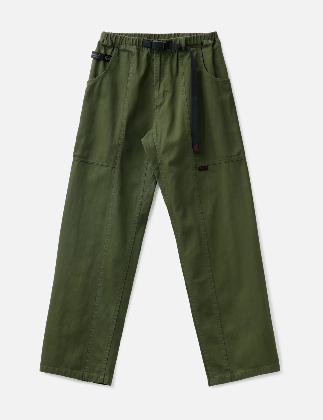 - Gramicci - Gadget Pant - Made of organic cotton - Washed twill fabric - Low rise - Tapered fit - Elastic waistband with belt - D-ring detail - Large wrap-around pockets - Diamond-shaped crotch gusset - Color: Olive - Material: 100% Cotton - See more Pants and Clothing SIZING - Model wears size M - Model measures: Height 184cm, Chest 29"/73cm, Waist 24"/62cm, Hip 35"/90cm