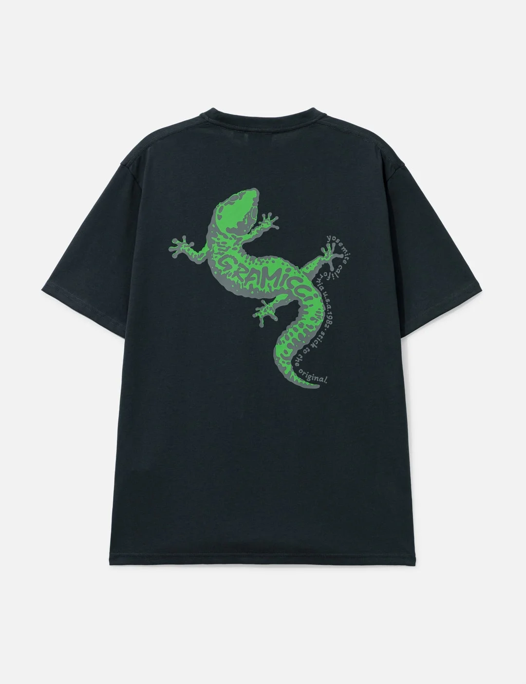 - Gramicci - Gecko Tee - Standard fit - Ribbed crewneck - Short sleeves - Logo printed on the front - Gecko and text graphics at back - Double-stitched hem - Color: Vintage Black - Material: 100% Cotton - See more SS T-Shirts, T-Shirts and Clothing - Model wears size M - Model measures: Height 186cm, Chest 34”/86cm, Waist 28”/71cm, Hip 36”/91cm - Vendor Code: G5FU-T133