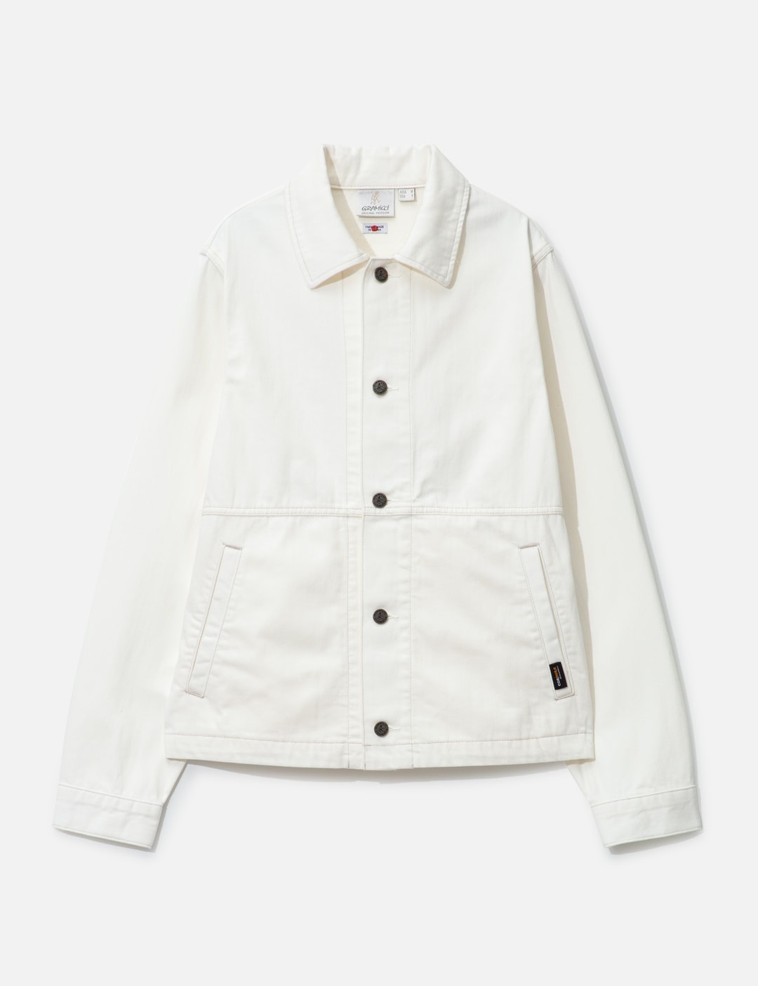 - Gramicci - Japanese Denim Jacket - Durable cotton blend Cordura fabric - Button closure - Two side pockets - Buttoned cuffs - Color: Stone - Material: 83% Cotton, 17% Nylon - See more Jackets and Clothing SIZING - Model wears Asian size M - Model measures: Height 186cm, Chest 34”/86cm, Waist 28”/71cm, Hip 36”/91cm