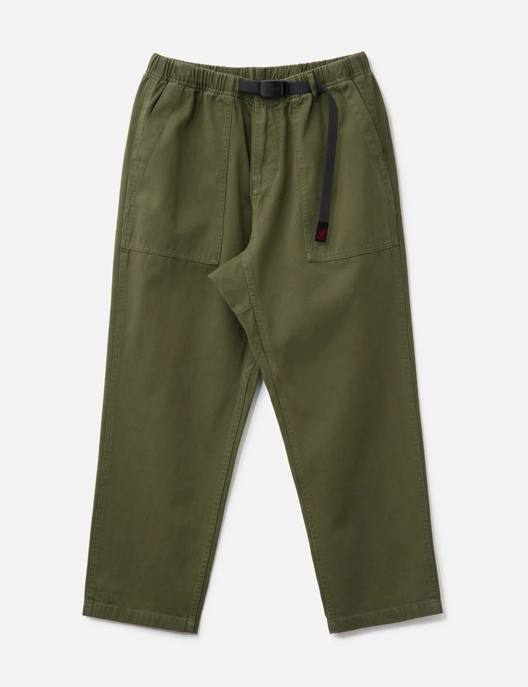 - Gramicci - Loose Tapered Pant - Organic cotton twill exterior - Tapered legs - Elasticated waistband with integrated belt - Zip closure - Gusseted crotch for ease of movement - Two front pockets - Two rear welt pockets - Cropped hem - Color: Olive - Material: 100% Cotton - See more Pants and Clothing - Model wears size M - Model measures: Height 186cm, Chest 34”/86cm, Waist 28”/71cm, Hip 36”/91cm - Vendor Code: G103-OGT
