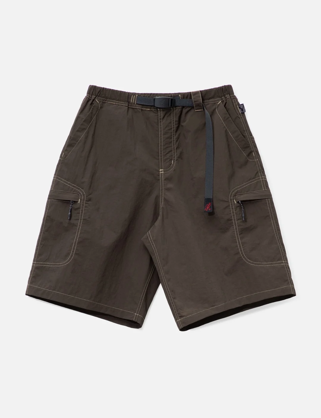 - Gramicci - Nylon Cliff Short - Relaxed fit - Made of nylon - Elastic waistband with integrated buckled belt - Brand label at belt tip - Zip fly - Two front slant pockets - Top-stitching allover - Two side zipper pockets - Back utility pockets with nylon straps - Color: Chocolate - Material: 100% Nylon - See more Shorts and Clothing - Model wears size M - Model measures: Height 186cm, Chest 34”/86cm, Waist 28”/71cm, Hip 36”/91cm - Vendor Code: G6SM-P034