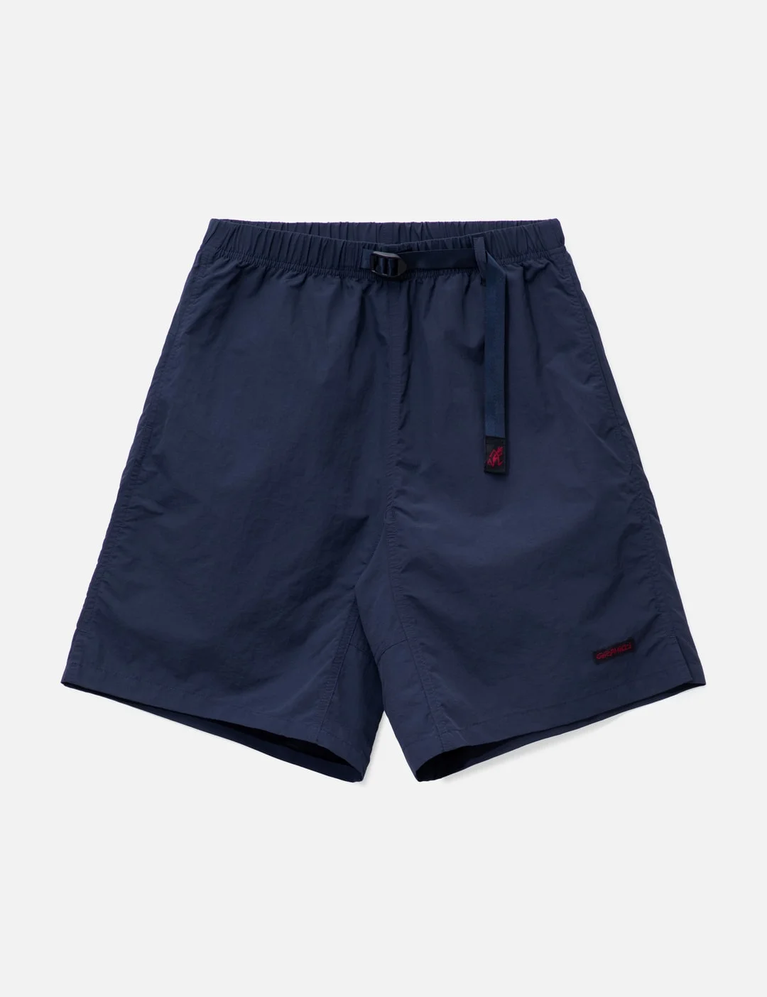 - Gramicci - Nylon Packable G-Short - Relaxed fit - Made of recycled durable nylon - Water-repellent windproof active shell fabric - Chlorine resistant - Elastic waistband with integrated buckled belt - Brand label at belt tip and hem - Zip fly - Gusseted crotch seam - Two front pockets - One back zipper pocket - Color: British Navy - Material: 100% Nylon - See more Shorts and Clothing - Model wears size M - Model measures: Height 186cm, Chest 34”/86cm, Waist 28”/71cm, Hip 36”/91cm - Vendor Code: G6SM-P082