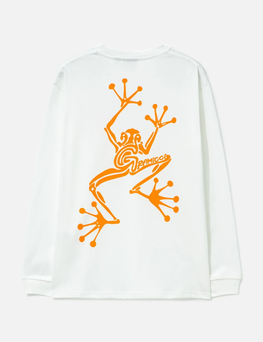 - Gramicci - Sticky Hands Long Sleeves T-Shirt - Regular fit - Made of cotton - Ribbed crewneck and cuffs - Long sleeves - Frog graphic print on front and back - Color: White - Material: 100% Cotton - See more LS T-Shirts, T-Shirts and Clothing - Model wears size M - Model measures: Height 186cm, Chest 34”/86cm, Waist 28”/71cm, Hip 36”/91cm - Vendor Code: G6SU-T108
